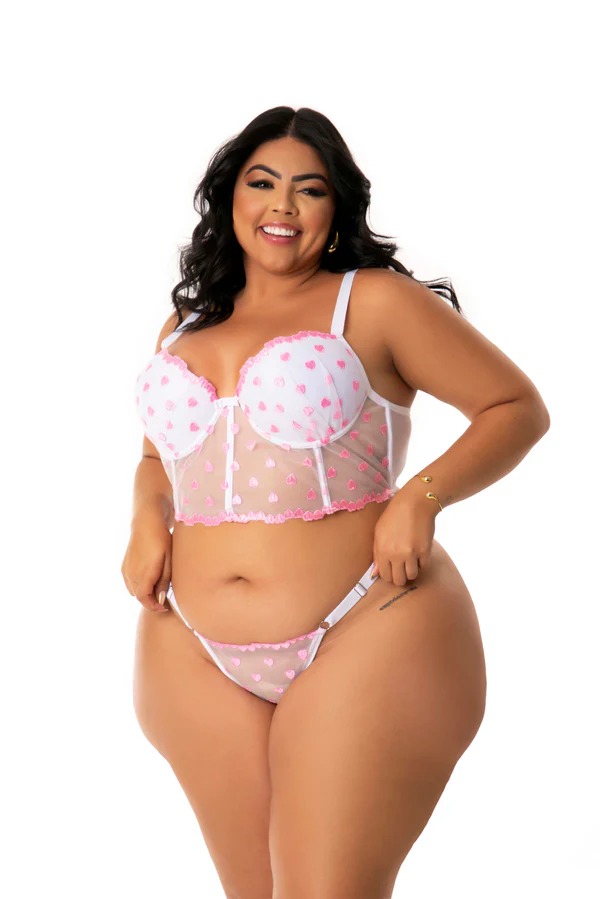 O conjunto sexy plus size em tule desenhado Britney é a escolha perfeita para destacar sua sensualidade com elegância e conforto. Com sutiã estilo cropped de bojo e corpo em tule bordado, ele oferece excelente sustentação graças ao arco de viés, paletas abaixo do busto e alças reforçadas com regulagem em metal. A calcinha fio dental string complementa o conjunto com tule delicado, aviamentos de microfibra e alças com regulagem, proporcionando um caimento seguro e sensual. Ideal para mulheres que buscam lingerie plus size marcante em Uberlândia.
