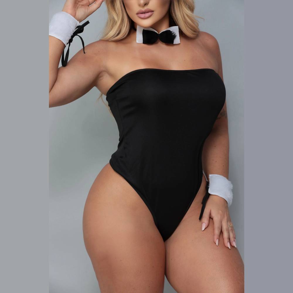 Vista o body como uma lingerie comum, ajustando-o delicadamente ao corpo para melhor caimento. Coloque a gargantilha de gravata no pescoço, ajuste o acessório na cabeça e finalize com as pulseiras peluciadas nos punhos. Ideal para momentos íntimos, ensaios sensuais ou festas à fantasia, garantindo um visual marcante e cheio de atitude.